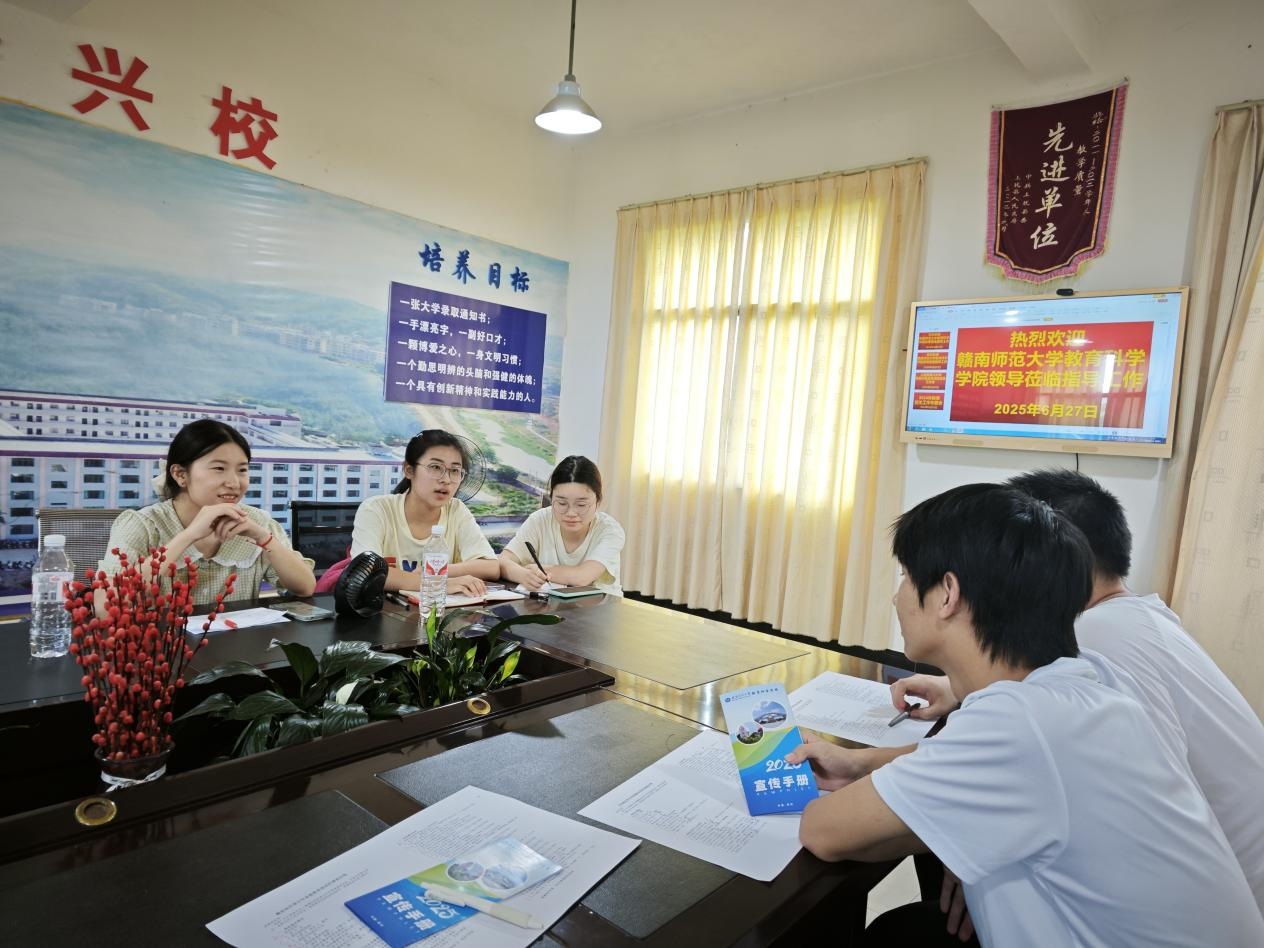 调研活动伊始,上犹三中校方代表以饱满的热情接待了“打捞教育火种”赣南红色教育调研实践队。校领导与实践团队带队老师进行了深入交流,双方围绕红色文化教育、青少年思政工作创新等话题展开讨论。校方详细介绍了学校在办学情况、教育特色以及未来课程改革的发展方向。带队老师则介绍了此次社会实践的目标和调研方向,希望深入了解青少年对红色故事的认知和接受方式,探索更具吸引力的红色文化传播模式以及有关家庭教育和短视频相关内容的调查。
